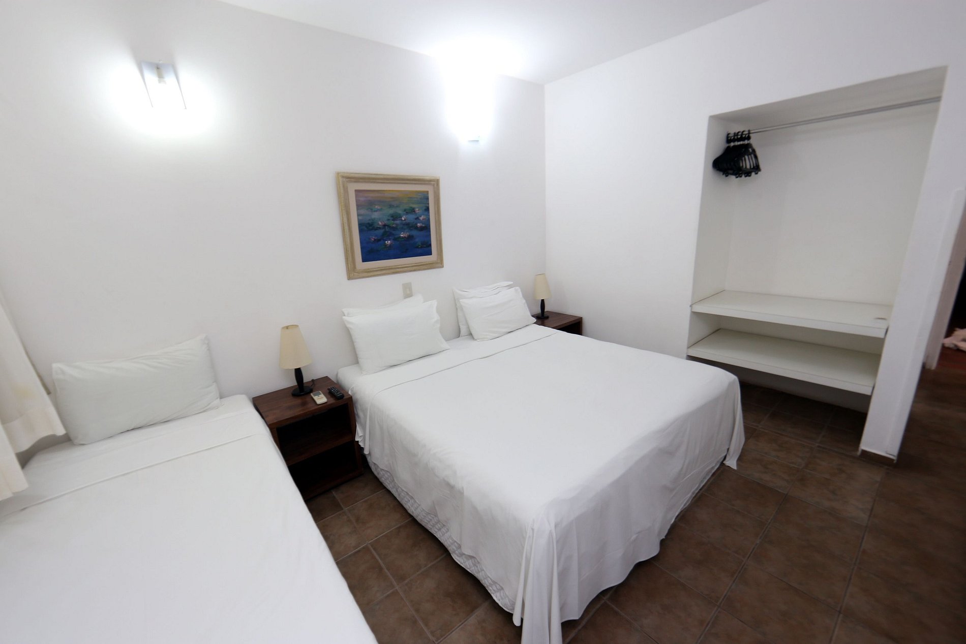 Quarto confortável, localizado dentro do condomínio do hotel Delphin. Acesso a aérea de lazer do hotel como piscina e serviço de praia (guarda-sol e cadeiras). Dispõe de 01 cama de casal, 01 cama de solteiro, 01 toalete, ar condicionado, TV a cabo, frigobar e uma vaga de estacionamento cortesia. Inclui enxoval e arrumação diária.