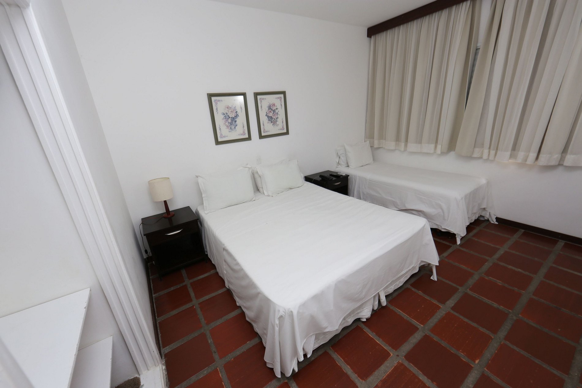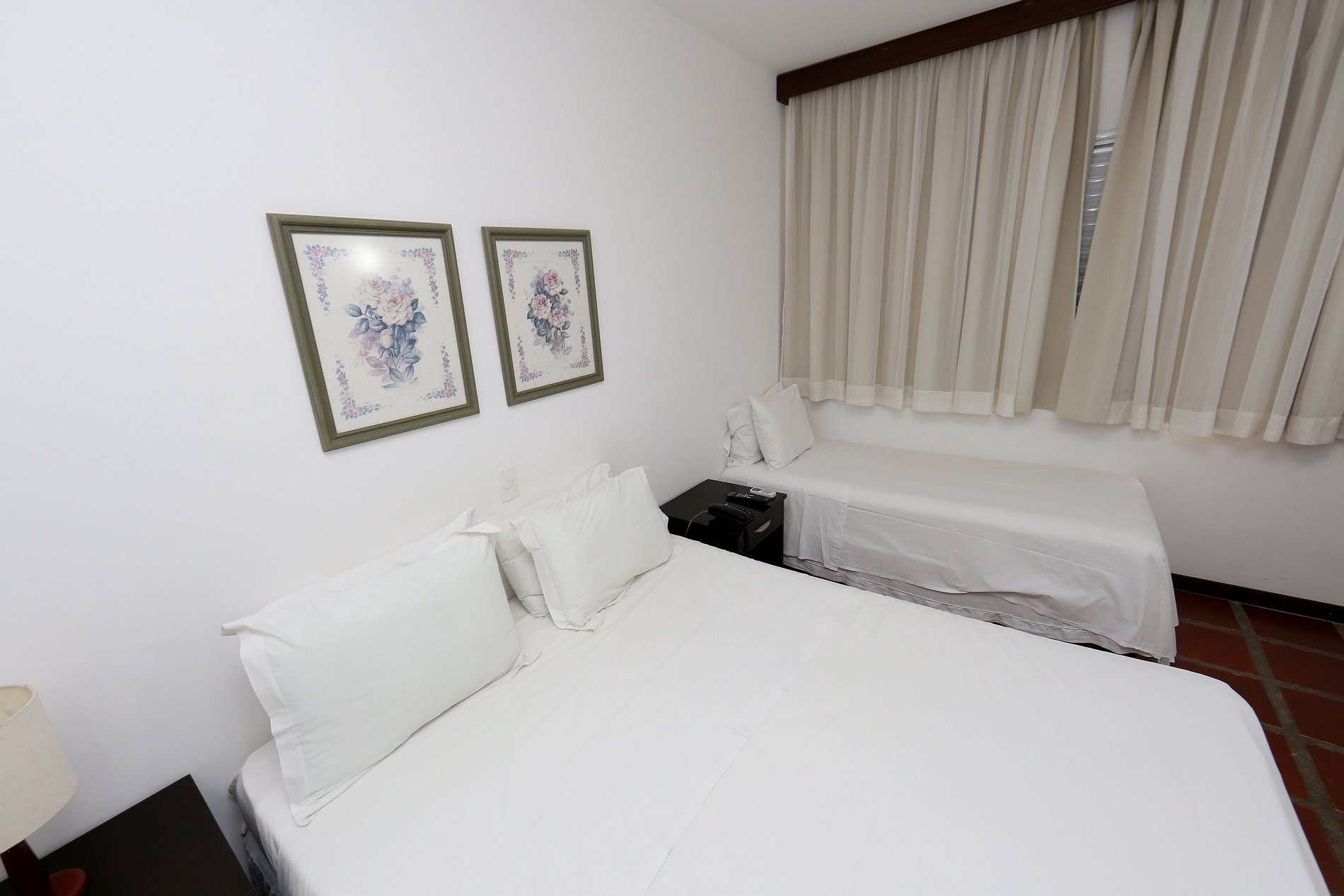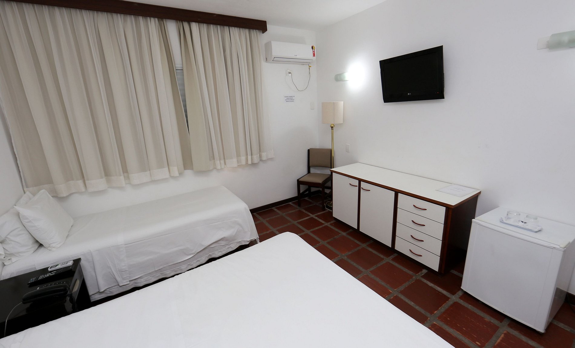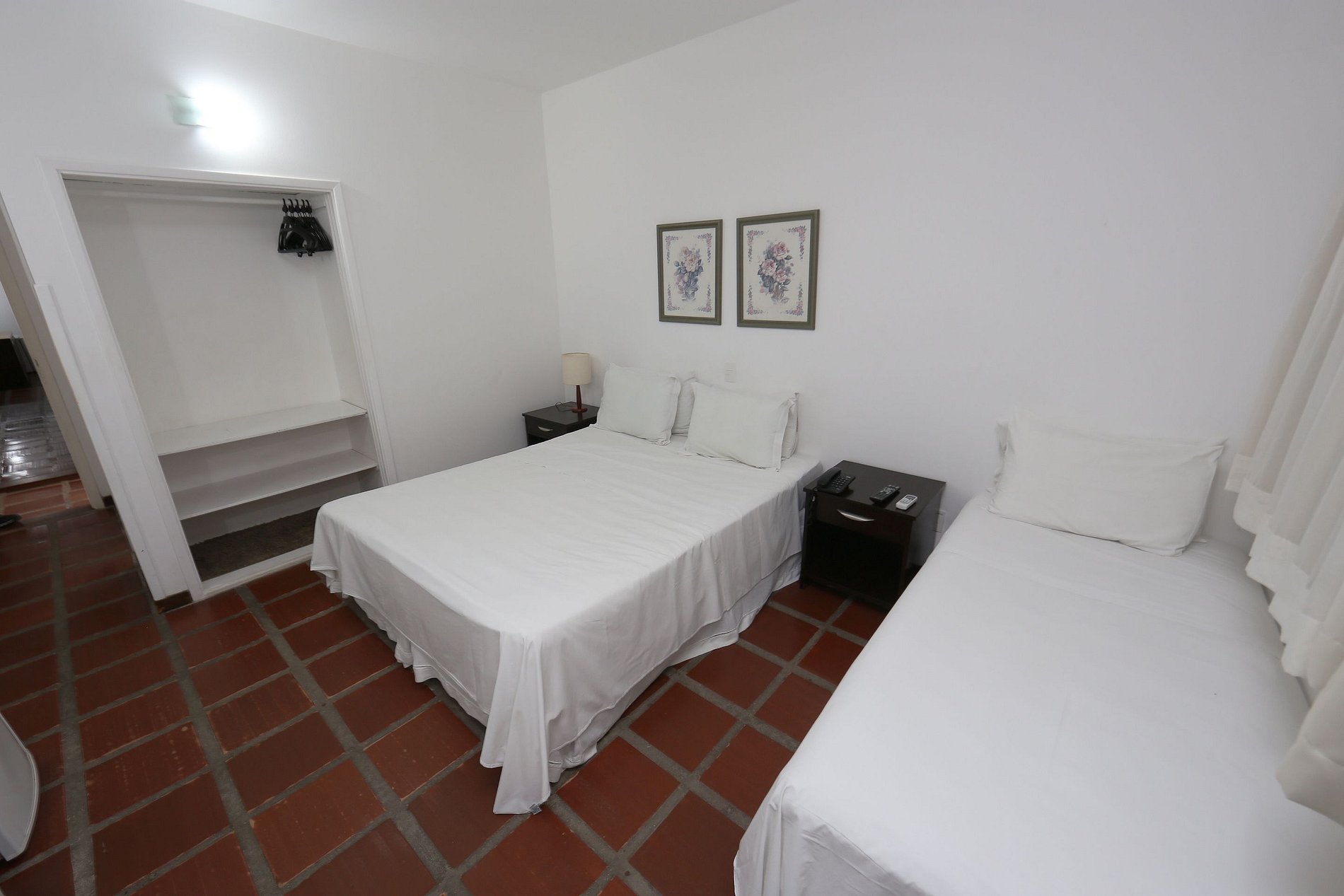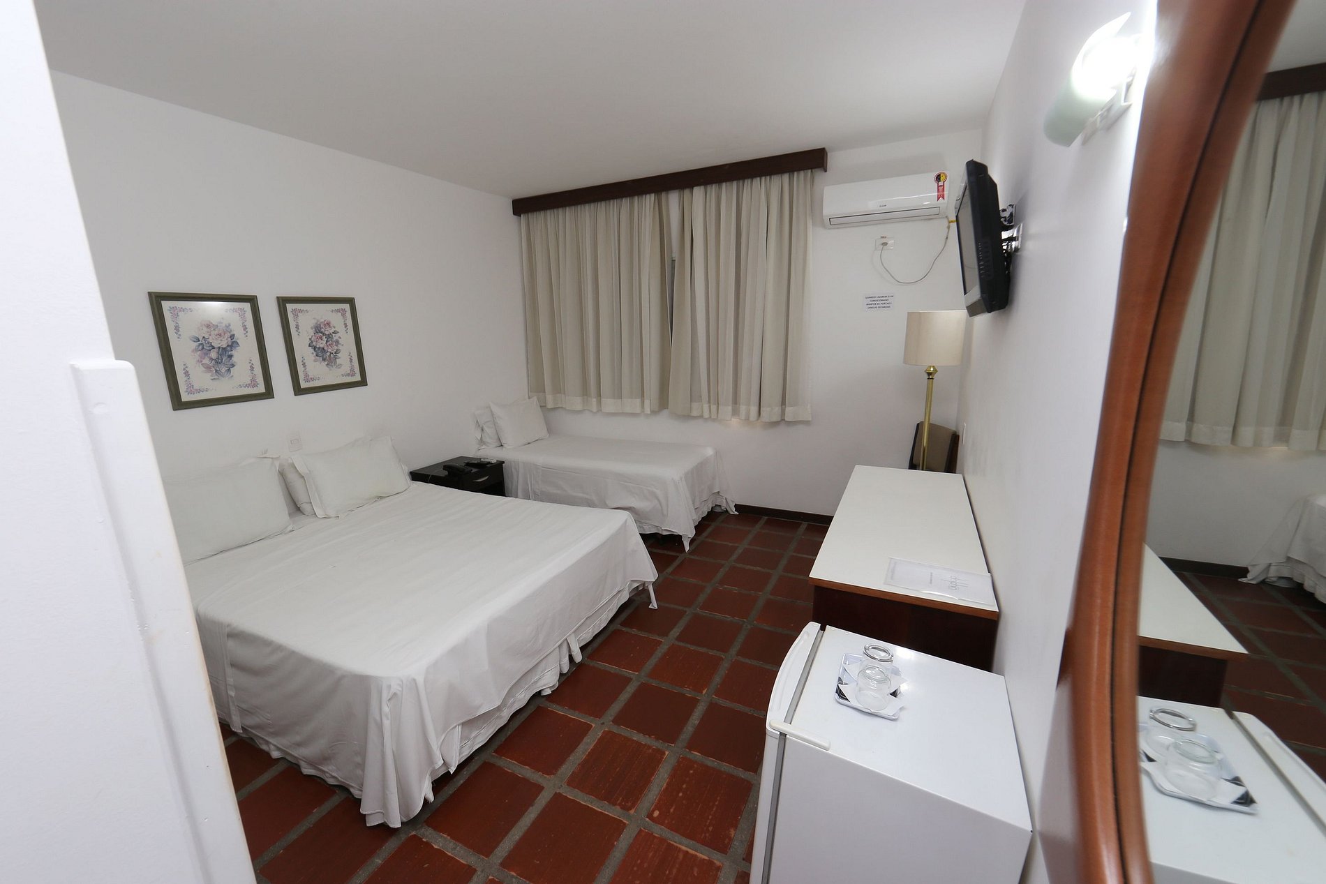 Quarto com 01 cama de casal, 01 cama de solteiro, TV a cabo, ar condicionado, TV a cabo, frigobar, banheiro privativo. Enxoval, arrumação diária e 01 vaga estacionamento cortesia.