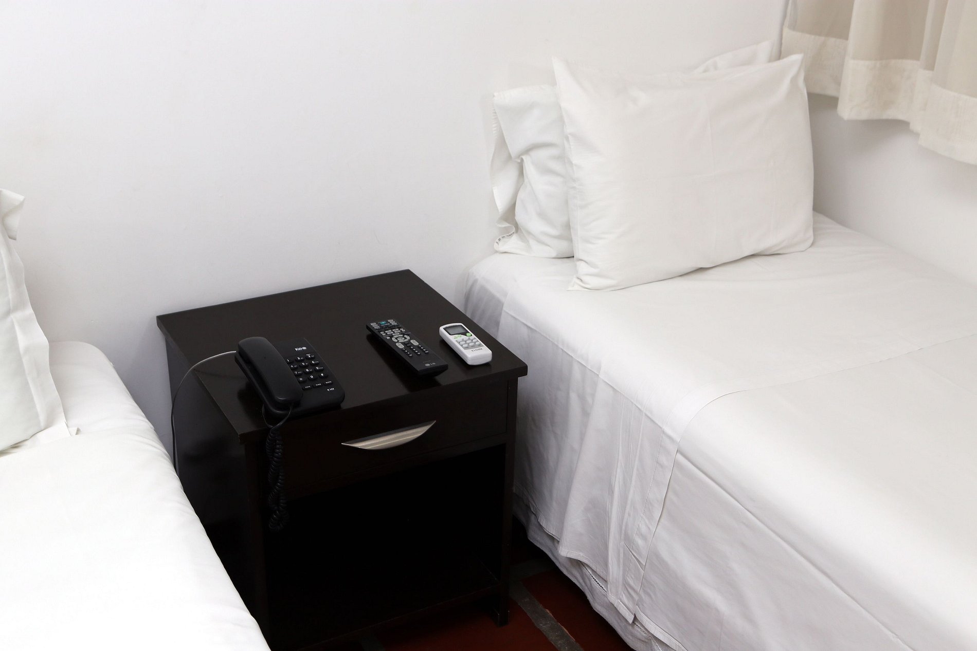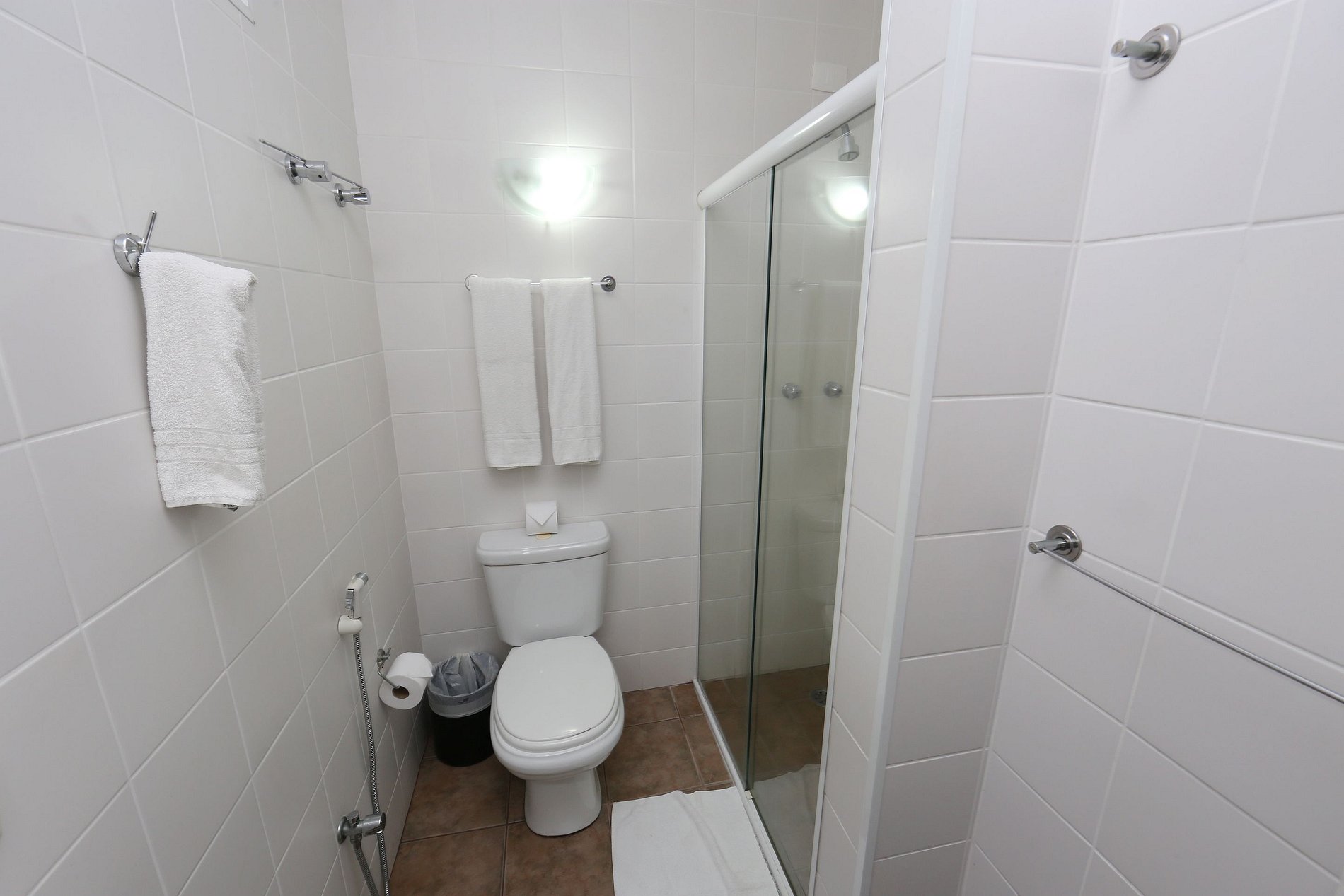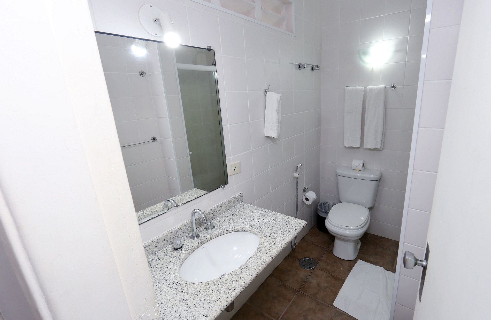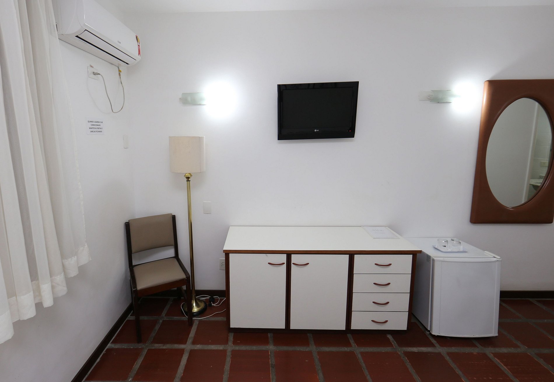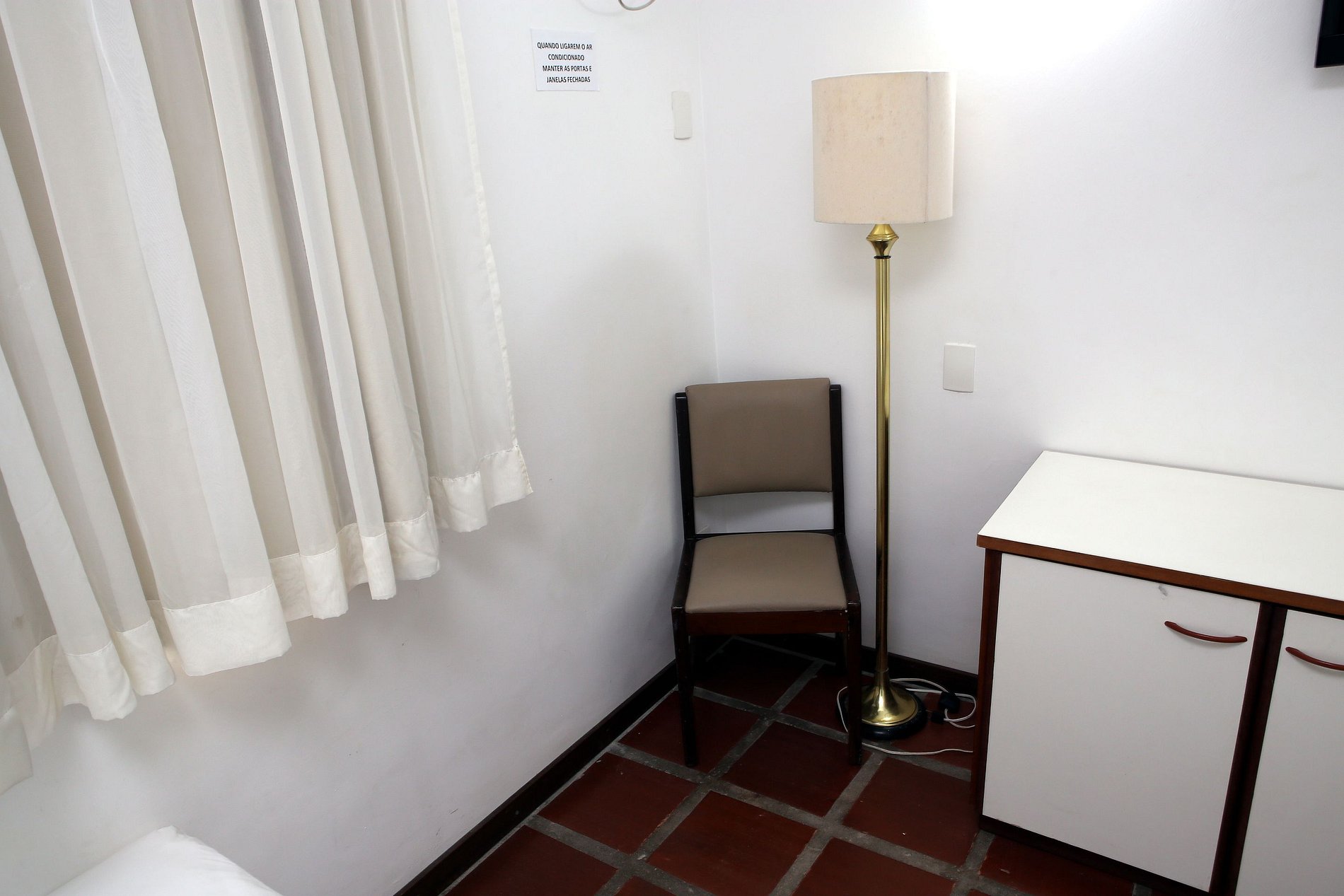 Quarto com 01 cama de casal, 01 cama de solteiro, TV a cabo, ar condicionado, TV a cabo, frigobar, banheiro privativo. Enxoval, arrumação diária e 01 vaga estacionamento cortesia.